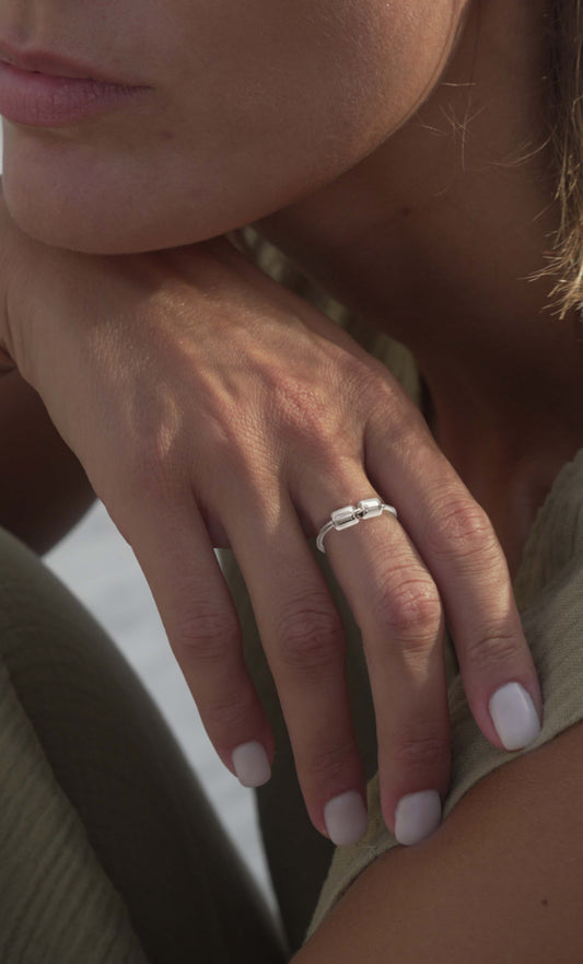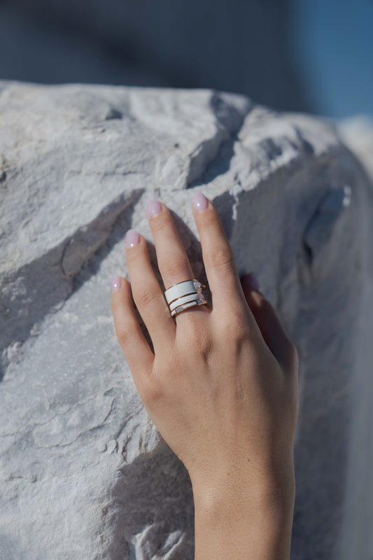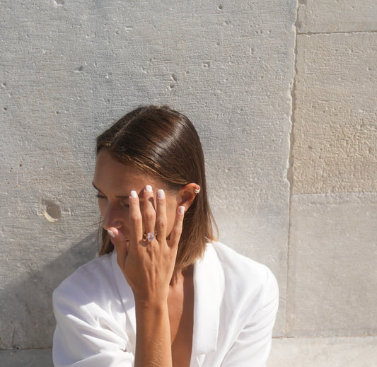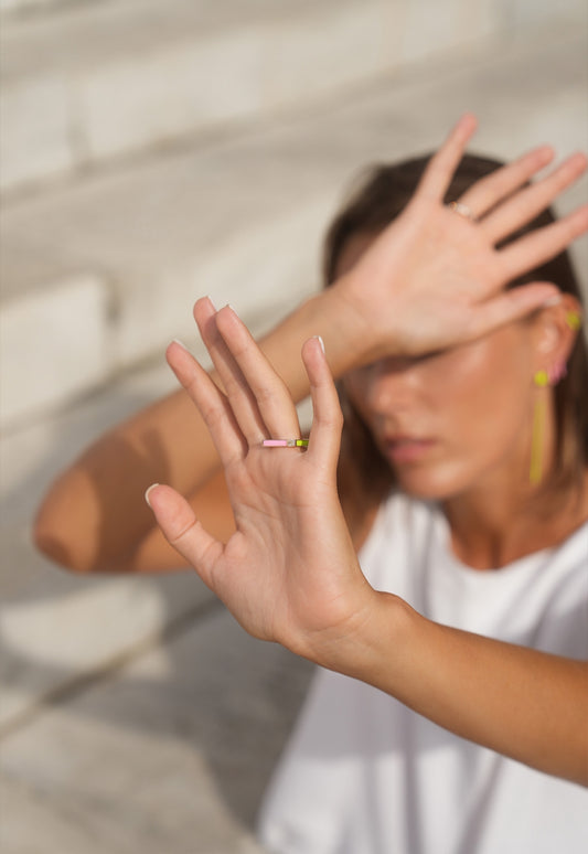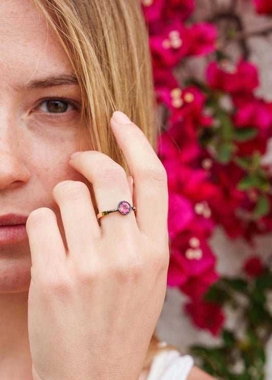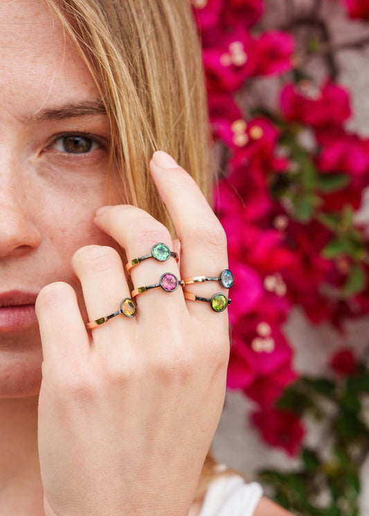 Ogni anello è impreziosito da una pietra dal taglio rotondo, disponibile in tonalità vivaci: rosa intenso, blu profondo e verde cristallino.
