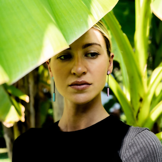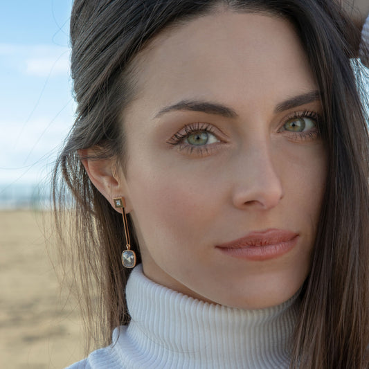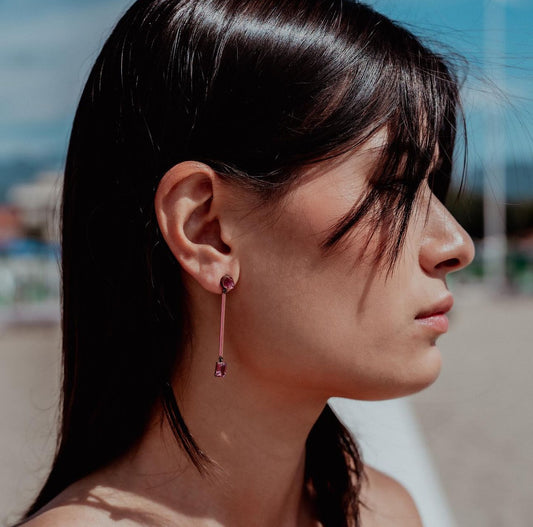 Questa collezione racchiude due diverse tipologie di orecchini: gli orecchini pendenti in oro rosa 18 carati e i piccoli rettangoli in oro 18carati.