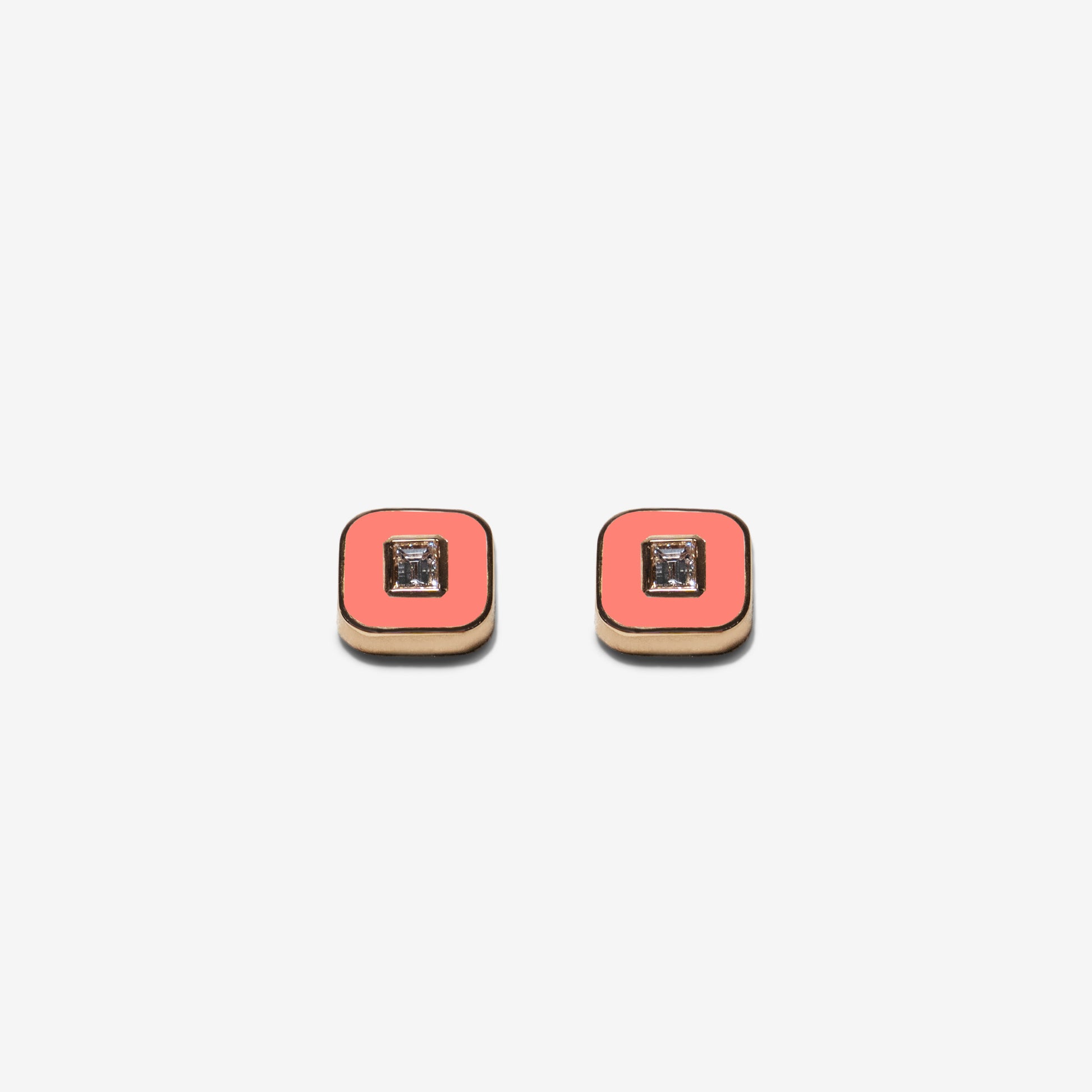 Realizzati in oro 18 carati con smalto rosa salmone, introducono una nota cromatica luminosa e contemporanea, capace di illuminare il volto con discrezione e personalità. Le proporzioni misurate e la pulizia delle linee rendono questi orecchini naturalmente versatili, perfetti da indossare ogni giorno o da inserire in combinazioni più ricercate.