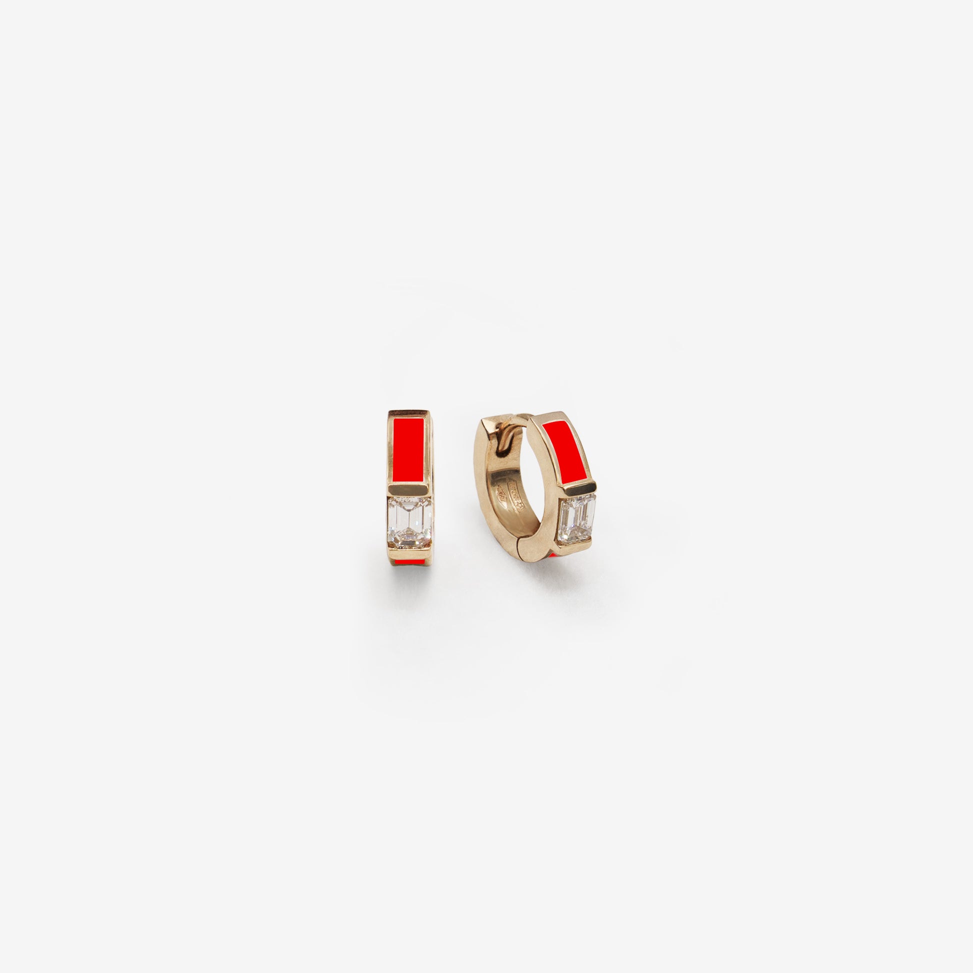 Orecchini in oro rosa 18 carati e smalto rosso con diamante taglio smeraldo di 0.12ct.