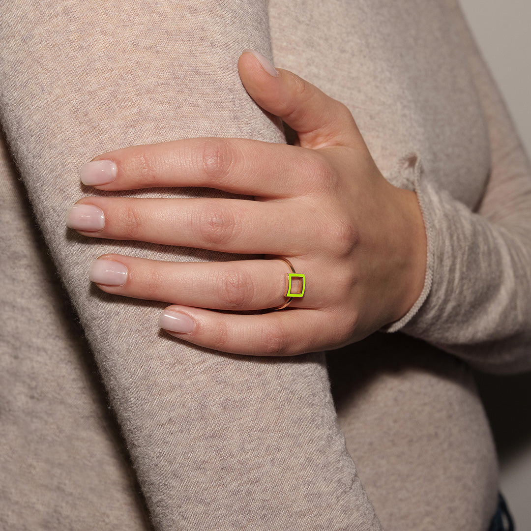 Anello quadrato in oro 18 carati con smalto verde lime.