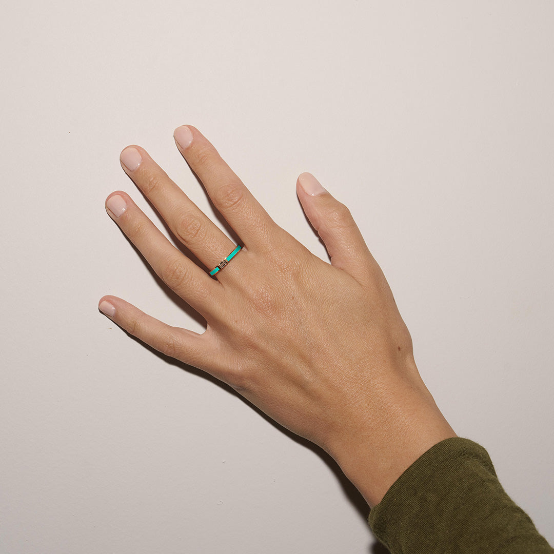 Anello in oro rosa 18 carati, smalto turchese e diamante taglio smeraldo